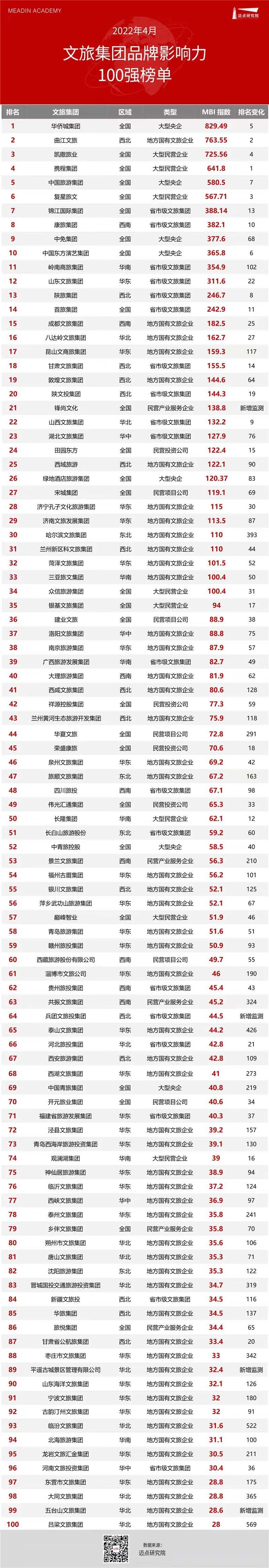 12月首次进入全国文旅集团品牌影响力百强榜后再次进入榜单,同时在细分榜单全国大型民营企业榜位列第5位,紧随复星旅文集团。前不久,银基文旅集团刚入选了焦点研究院发布的全国文旅运营商品牌传播力T0P20。